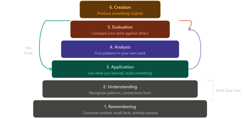 Level one is remembering. You consume content. You recall facts. This is entirely passive. You read something, maybe you remember it, probably you forget it within a week.